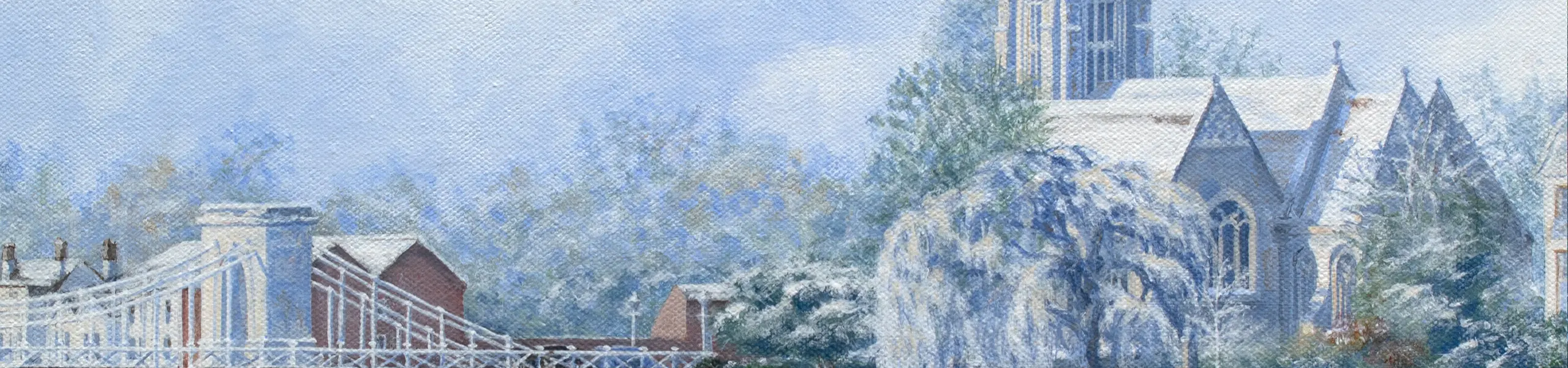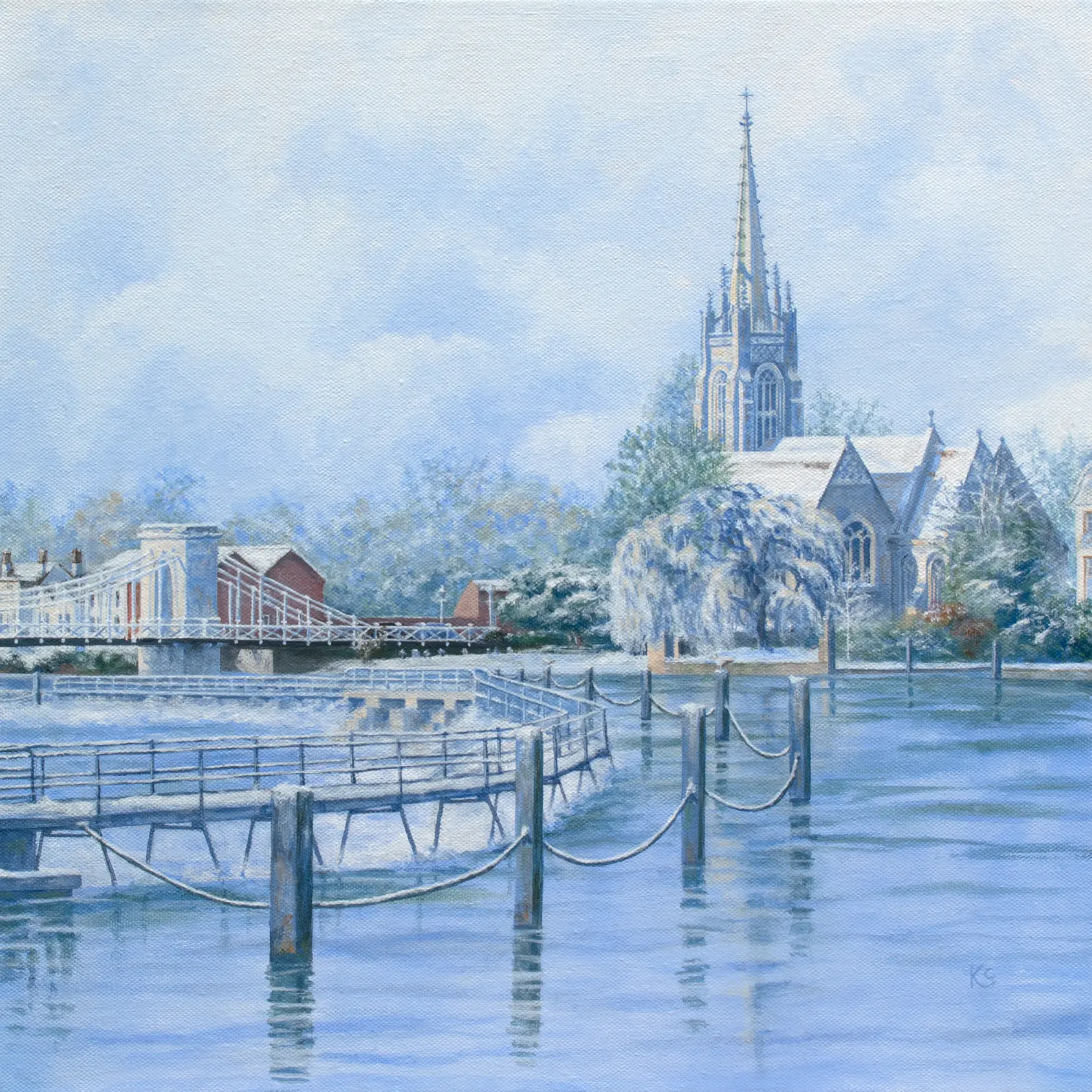 The beautiful and iconic All Saints Church at Marlow overlooking the wonderful bridge and picturesque weir. It was a joy to paint the architecture!